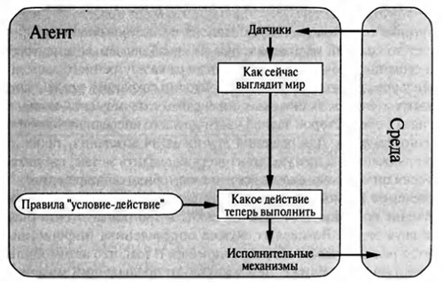Программа, приведенная в листинге, специализирована для одной конкретной среды пылесоса. Более общий и гибкий подход состоит в том, чтобы вначале создать интерпретатор общего назначения для правил условие-действие, а затем определить наборы правил для конкретной проблемной среды. На рисунке приведена структура такой общей программы в схематической форме и показано, каким образом правила условие-действие позволяют агенту создать связь от восприятия к действию. (Не следует беспокоиться, если такой способ покажется тривиальным; вскоре он обнаружит намного более интересные возможности.)