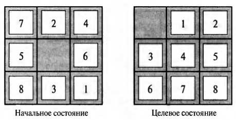 Задача игры в восемь, состоит из доски 3x3 с восемью пронумерованными фишками и с одним пустым участком. Фишка, смежная с пустым участком, может быть передвинута на этот участок. Требуется достичь указанного целевого состояния, подобного тому, которое показано в правой части рисунка. Стандартная формулировка этой задачи приведена ниже.