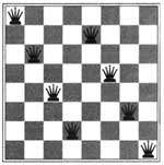 Цель задачи с восемью ферзями состоит в размещении восьми ферзей на шахматной доске таким образом, чтобы ни один ферзь не нападал на любого другого. (Ферзь атакует любую фигуру, находящуюся на одной и той же с ним горизонтали, вертикали или диагонали.) На рисунке показана неудачная попытка поиска решения: ферзь, находящийся на самой правой вертикали, атакован ферзем, который находится вверху слева.