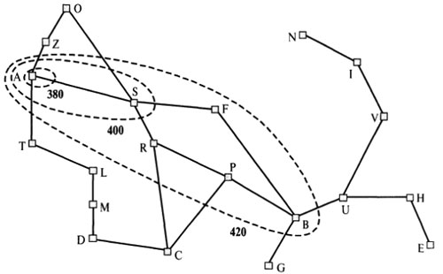 Карта Румынии, на которой показаны контуры, соответствующие f=380, f = 4 00 и f = 420, притом что Arad является начальным состоянием. Узлы в пределах данного конкретного контура имеют f-стоимости, меньшие или равные значению стоимости контура