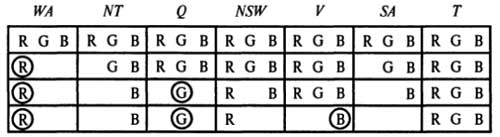 Поиск решения задачи с раскрашиванием карты на основе предварительной проверки. Вначале выполняется присваивание WA=red, затем предварительная проверка приводит к удалению значений red из областей определения соседних переменных NT и SA. После присваивания Q=green значение green удаляется из областей определения NT, SA и NSW. После присваивания V=blue из областей определения NSW и SA удаляется значение blue, в результате чего переменная SA остается без допустимых значений