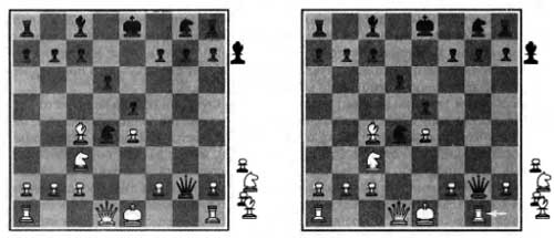 | | Две немного разные шахматные позиции: черные имеют преимущество в одного коня и двух пешек и должны выиграть партию (а); черные проигрывают после того, как белые берут ферзя (б) |