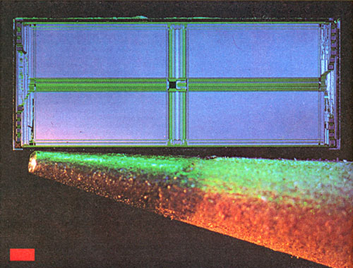 Приведенные здесь три фотографии сделаны под микроскопом со всевозрастающим увеличением. Это позволяет все более отчетливо видеть плотно заполненную ячейками поверхность кристалла-памяти, который обеспечивает считывание и запись данных. Реальные размеры кристалла - это красный прямоугольник в левом нижнем углу на первой фотографии. Называемая памятью с произвольной выборкой, или оперативной памятью (оперативное запоминающее устройство, ОЗУ), эта схема дает компьютеру возможность хранить данные временно, т. е. до тех пор, пока не отключено питание. При отключении питания информация в ОЗУ стирается.