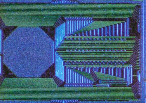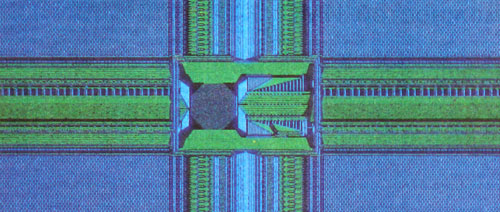 Весь массив из 272 144 ячеек памяти поделен на четыре равные прямоугольные секции, как видно на первых двух фотографиях. В каждой секции ячейки выстроены по строкам и столбцам. Благодаря такому расположению, подобному сетке на миллиметровой бумаге, каждая ячейка имеет свои координаты. Поиск ячейки с заданными координатами осуществляется специальными дешифрующими схемами, которые двумя полосами пересекают кристалл по горизонтали и вертикали. Когда центральный процессор компьютера сообщает адрес нужного байта (8 бит) данных, горизонтальные дешифраторы указывают нужный столбец, а вертикальные - строку. Вся операция определение ячейки по заданному адресу и выборка из нее байта данных - занимает менее миллионной доли секунды.