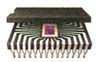 | | Монокристальный микрокомпьютер в своих истинных размерах - 0,25 сантиметров квадратных. Верхнее пластмассовое покрытие слегка приподнято, чтобы показать сам кристалл и паутину металлических соединений, по которым проходят электрические сигналы. Эти соединения заканчиваются двумя рядами выводов (по 14 выводов в каждом), которые, словно ножки гусеницы, торчат из корпуса микросхемы; их вставляют в специальные гнезда на плате калькулятора, управляемого микропроцессором. |