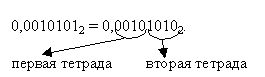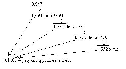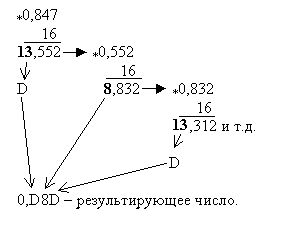 Правила перевода правильных дробей Напомним, что правильная дробь имеет нулевую целую часть, т.е. у нее числитель меньше знаменателя. Результат перевода правильной дроби всегда правильная дробь. Перевод из десятичной системы счисления в двоичную и шестнадцатеричную: а) исходная дробь умножается на основание системы счисления, в которую переводится (2 или 16); б) в полученном произведении целая часть преобразуется в соответствии с таблицей в цифру нужной системы счисления и отбрасывается – она является старшей цифрой получаемой дроби; в) оставшаяся дробная часть (это правильная дробь) вновь умножается на нужное основание системы счисления с последующей обработкой полученного произведения в соответствии с шагами а) и б); г) процедура умножения продолжается до тех пор, пока ни будет получен нулевой результат в дробной части произведения или ни будет достигнуто требуемое количество цифр в результате; д) формируется искомое число: последовательно отброшенные в шаге б) цифры составляют дробную часть результата, причем в порядке уменьшения старшинства. Пример 1. Выполнить перевод числа 0,847 в двоичную систему счисления. Перевод выполнить до четырех значащих цифр после запятой. Имеем:  Таким образом, 0,847 = 0,11012. В данном примере процедура перевода прервана на четвертом шаге, поскольку получено требуемое число разрядов результата. Очевидно, это привело к потере ряда цифр. Пример 2. Выполнить перевод числа 0,847 в шестнадцатеричную систему счисления. Перевод выполнить до трех значащих цифр. Имеем:  В данном примере также процедура перевода прервана. Таким образом, 0,847 = 0,D8D16. Перевод из двоичной и шестнадцатеричной систем счисления в десятичную. В этом случае рассчитывается полное значение числа по формуле, причем коэффициенты ai принимают десятичное значение в соответствии с таблицей. Пример 3. Выполнить перевод из двоичной системы счисления в десятичную числа 0,11012. Имеем: 0,11012 = 1*2-1 + 1*2-2 + 0*2-3 +1*2-4 = 0,5 + 0,25 + 0 + 0,0625 = 0,8125. Расхождение полученного результата с исходным числом (см. пример 1) вызвано тем, что процедура перевода в двоичную дробь была прервана. Таким образом, 0,11012 = 0,8125. Пример 4. Выполнить перевод из шестнадцатеричной системы счисления в десятичную числа 0,D8D16. Имеем: 0,D8D16 = 13*16-1 + 8*16-2 + 13*16-3 = 13*0,0625 + 8*0,003906 + 13* 0,000244 = 0,84692. Расхождение полученного результата с исходным числом (см. пример 2) вызвано тем, что процедура перевода в шестнадцатеричную дробь была прервана. Таким образом, 0,D8D16 = 0,84692. Перевод из двоичной системы счисления в шестнадцатеричную: а) исходная дробь делится на тетрады, начиная с позиции десятичной точки вправо. Если количество цифр дробной части исходного двоичного числа не кратно 4, оно дополняется справа незначащими нулями до достижения кратности 4; б) каждая тетрада заменяется шестнадцатеричной цифрой в соответствии с таблицей. Пример 5. Выполнить перевод из двоичной системы счисления в шестнадцатеричную числа 0,11012. Имеем:  В соответствии с таблицей 11012 = D16. Тогда 0,11012 = 0,D16. Пример 6. Выполнить перевод из двоичной системы счисления в шестнадцатеричную числа 0,00101012. Поскольку количество цифр дробной части не кратно 4, добавим справа незначащий ноль:  В соответствии с таблицей 00102 = 102 = 216 и 10102 = A16. Тогда 0,00101012 = 0,2A16. Перевод из шестнадцатеричной системы счисления в двоичную: а) каждая цифра исходной дроби заменяется тетрадой двоичных ц
