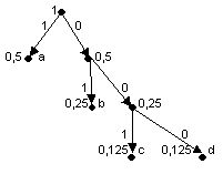 Этот метод имеет два преимущества по сравнению с методом Шеннона-Фано: он устраняет неоднозначность кодирования, возникающую из-за примерного равенства сумм частот при разделении списка на две части (линия деления проводится неоднозначно), и имеет, в общем случае, большую эффективность кода. Исходное множество символов упорядочивается по не возрастанию частоты и выполняются следующие шаги: 1) объединение частот: · две последние частоты списка складываются, а соответствующие символы исключаются из списка; · оставшийся после исключения символов список пополняется суммой частот и вновь упорядочивается; · предыдущие шаги повторяются до тех пор, пока ни получится единица в результате суммирования и список ни уменьшится до одного символа; 2) построение кодового дерева: · строится двоичное кодовое дерево: корнем его является вершина, полученная в результате объединения частот, равная 1; листьями – исходные вершины; остальные вершины соответствуют либо суммарным, либо исходным частотам, причем для каждой вершины левая подчиненная вершина соответствует большему слагаемому, а правая – меньшему; ребра дерева связывают вершины-суммы с вершинами-слагаемыми. Структура дерева показывает, как происходило объединение частот; · ребра дерева кодируются: каждое левое кодируется единицей, каждое правое – нулем; 3) формирование кода: для получения кодов листьев (исходных кодируемых символов) продвигаются от корня к нужной вершине и «собирают» веса проходимых ребер. Пример 1. Даны символы a, b, c, d с частотами fa = 0,5; fb = 0,25; fc = 0,125; fd= 0,125. Построить эффективный код методом Хаффмена. 1) объединение частот (результат объединения двух последних частот в списке выделен в правом соседнем столбце заливкой): | Исходные символы | Частоты fs | Этапы объединения | | первый | второй | третий | | a | 0,5 | 0,5 | 0,5 | 1 | | b | 0,25 | 0,25 | 0,5 | | | c | 0,125 | 0,25 | | | | d | 0,125 | | | | 2) построение кодового дерева:  3) формирование кода: a - 1; b - 01; c - 001; d - 000. Как видно, полученные коды совпадают с теми, что были сформированы методом Шеннона-Фано, следовательно, они имеют одинаковую эффективность.