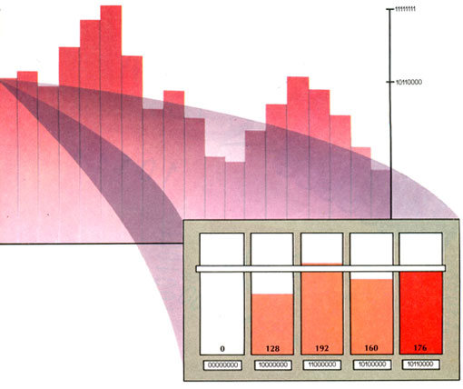 Прежде чем электронный цифровой компьютер сможет интерпретировать подлежащий обработке аналоговый сигнал, последний должен быть переведен на двоичный язык компьютера. Это достигается при помощи аналого-цифрового преобразователя (АЦП), который трансформирует изменяющееся напряжение сигнала в быстрые последовательности импульсов типа включен-выключен. Эти импульсы соответствуют как компьютерной логике - с ее значениями «да-нет» или «истина-ложь», - так и двоичному представлению чисел, позволяющему выразить любое число независимо от того, насколько оно велико, в виде комбинации нулей и единиц. В цифровом компьютере нули и единицы представлены двумя состояниями микросхем, на которых построено центральный процессор, а также внутренняя память и другие блоки компьютера.