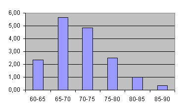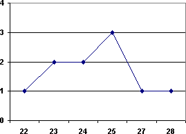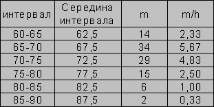 Допустим, из генеральной совокупности извлечена выборка объемом n, измерена некоторая величина Х, в результате чего получен ряд значений х1, х2, . . . хn. Этот ряд называется простым статистическим рядом. Пример: измерена масса тела 10 девочек 6 лет. Полученные данные образуют простой статистический ряд: 24 22 23 28 24 23 25 27 25 25 Отдельные значения статистического ряда называются вариантами. Если варианта хi появилась m раз, то число m называют частотой, а ее отношение к объему выборки m/n – относительной частотой. Последовательность вариант, записанная в возрастающем (убывающем) порядке, называется ранжированным рядом. Пример: Ранжированный ряд: 22 23 23 24 24 25 25 25 27 28 Таблица, в первой строке которой записаны все значения величины (варианты), во второй –- соответствующие им частоты, называется безынтервальным вариационным рядом. Пример: Безынтервальный вариационный ряд | Х | 22 | 23 | 24 | 25 | 27 | 28 | | m | 1 | 2 | 2 | 3 | 1 | 1 | Графическим изображением безынтервального вариационного ряда является полигон (рис. 1).  Рис. 1. Полигон вариационного ряда Для его построения на оси ОХ откладывают значения вариант, на оси ОУ –- соответствующие им частоты. Точки с координатами (хi; mi) соединяют отрезками, полученная ломаная линия называется полигоном частот. В том случае, если выборка представлена большим количеством различных значений непрерывной случайной величины, то группировку данных проводят в виде интервального вариационного ряда. Для этого диапазон варьирования признака разбивают на несколько (5-10) равных интервалов и указывают количество вариант, попавших в каждый интервал. Алгоритм построения интервального вариационного ряда 1. Исходя из объема выборки n, определить количество интервалов k. | n | 25-40 | 40-60 | 60-100 | 100-200 | >200 | | k | 5-6 | 6-8 | 7-10 | 8-12 | 10-15 | 2. Вычислить размах ряда: R=Xmax-Xmin 3. Определить ширину интервала: h=R/(k-1) 4. Найти начало первого интервала X0 = Xmin - h/2 5. Составить интервальный вариационный ряд. Пример: измерена масса тела 100 женщин 30 лет, получены значения от 60 до 90 кг. | интервалы | 60-65 | 65-70 | 70-75 | 75-80 | 80-85 | 85-90 | | количество | 14 | 34 | 29 | 15 | 6 | 2 | Размах ряда: R=Xmax-Xmin=90-60=30 Ширина интервала: h=R/(k-1)=30/5=6 Интервальный вариационный ряд:  Графическим изображением интервального вариационного ряда является гистограмма. Для ее построения на оси ОХ откладывают интервалы шириной h, на каждом интервале строят прямоугольник высотой m/h. Величина m/h называется плотностью частоты. Гистограмма является эмпирическим аналогом графика дифференциальной функции распределения.
