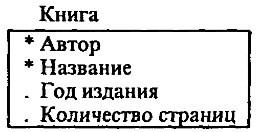 Реальный объект – это абстракция физически существующих предметов. Например, на автомобильном заводе это кузов автомобиля, двигатель, коробка передач; при перевозке грузов это контейнер, средство перевозки. Роль – абстракция цели или назначения человека, части оборудования или учреждения (организации). Например, в университете как в учебном заведении это студент, преподаватель, декан; в университете как в учреждении это приемная комиссия, отдел кадров, бухгалтерия, деканат. Событие – абстракция чего-то случившегося. Например, поступление заявления от абитуриента в приемную комиссию Университета, сдача (или несдача) экзамена. Взаимодействия – объекты, получаемые из отношений между другими объектами. Например, сделка, контракт (договор) между двумя сторонами, свидетельство об образовании, выдаваемое учебным заведением его выпускнику. Объекты-спецификации используются для представления правил, стандартов или критериев качества. Например, перечень знаний, умений и навыков выпускника математического факультета, рецепт проявления фотопленки. Для каждого объекта должно существовать его описание – короткое информационное утверждение, позволяющее установить, является некоторый предмет экземпляром объекта или нет. Например, описание объекта “Абитуриент университета” может быть следующим: человек в возрасте до 35 лет, имеющий среднее образование, подавший в приемную комиссию документы и заявление о приеме. Предметы реального мира имеют характеристики (такие, например, как имя, название, регистрационный номер, дата изготовления, вес и т.д.). Каждая отдельная характеристика, общая для всех возможных экземпляров объекта, называется атрибутом. Для каждого экземпляра атрибут принимает определенное значение. Так, объект Книга имеет атрибуты Автор, Название, Год издания. Число страниц. У каждого объекта должен быть идентификатор – множество из одного или более атрибутов, значения которых определяют каждый экземпляр объекта. Для книги атрибуты Автор и Название совместно образуют идентификатор. В тоже время Год издания и Число страниц идентификаторами быть не могут – ни врозь, ни совместно, так как не определяют объект. Объект может иметь и несколько идентификаторов, каждый из которых составлен из одного или нескольких атрибутов. Один из них может быть выбран как привилегированный для соответствующей ситуации. Объект может быть представлен вместе со своими атрибутами несколькими различными способами. Графически объект может быть изображен в виде рамки, содержащей имя объекта и имена атрибутов. Атрибуты, которые составляют привилегированный идентификатор объекта, могут быть выделены (например, символом * слева от имени атрибута):  В эквивалентном текстовом представлении это может иметь следующий вид: Книга (Автор. Название. Год издания. Число страниц). Привилегированный идентификатор подчеркивается. Еще одним способом представления объекта информационной модели является таблица. В этой интерпретации каждый экземпляр объекта является строкой в таблице, а значения атрибутов, соответствующих каждому экземпляру, – клетками строки, табл. 1. Таблица 1. Таблица как представление информационной модели | Автор | Книга | | Название | Год издания | Число страниц | | Грин А. Стивенсон Р. П. Скотт В. Гончаров И. А. | Бегущая по волнам Остро