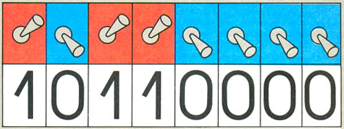 | Естественность цифрового ввода | | Не все данные, вводимые в компьютер, имеют аналоговое происхождение. Значительная часть информации, обрабатываемой компьютером, изначально является цифровой и вводится с таких устройств, как клавиатура или накопители на магнитной ленте. Здесь в упрощенном виде показано действие цифрового вводного устройства; число 10110000, двоичный эквивалент числа 176, набирается с помощью ручных переключателей, имеющих два положения: одно соответствует 1 (включен), а другое - 0 (выключен).