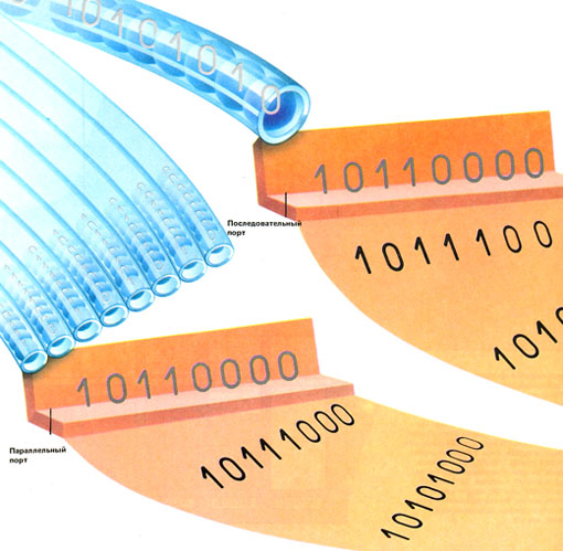 Как только информация закодирована в виде двоичных импульсов, она может быть введена в компьютер через так называемые порты либо в последовательном, либо в параллельном режиме. Иначе говоря, порты бывают последовательными или параллельными в зависимости от способа передачи битов.