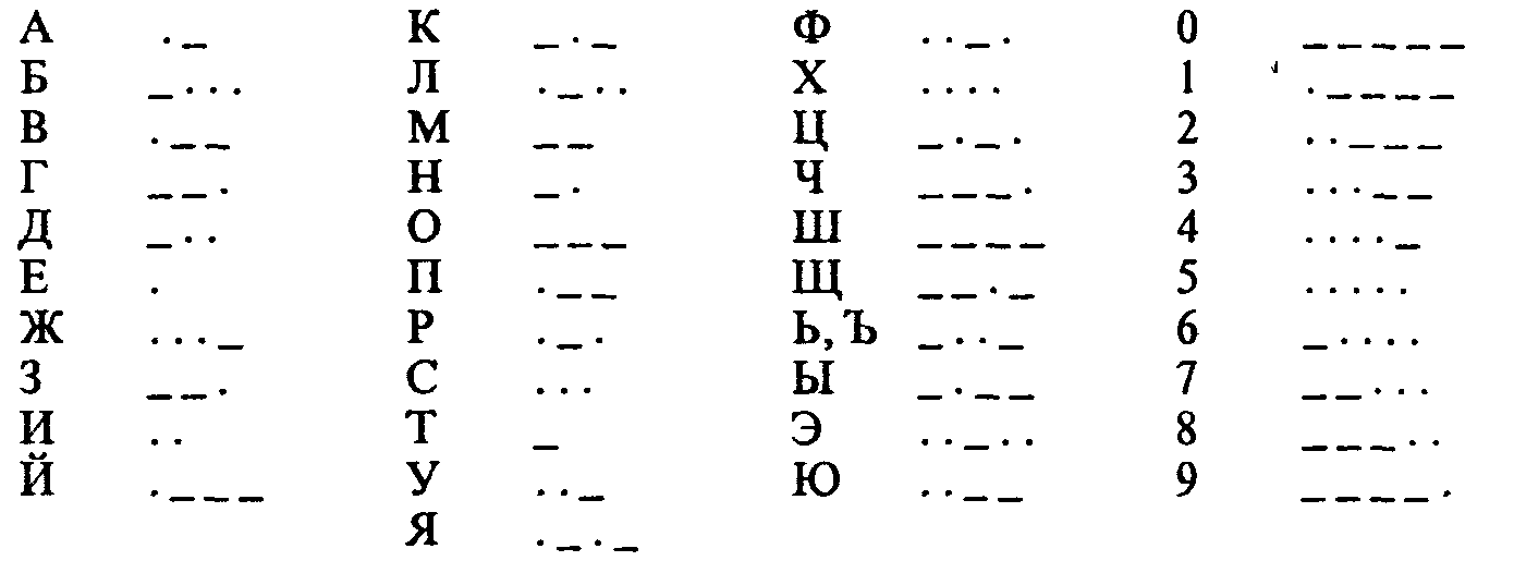 В канале связи сообщение, составленное из символов (букв) одного алфавита, может преобразовываться в сообщение из символов (букв) другого алфавита. Правило, описывающее однозначное соответствие букв алфавитов при таком преобразовании, называют кодом. Саму процедуру преобразования сообщения называют перекодировкой. Подобное преобразование сообщения может осуществляться в момент поступления сообщения от источника в канал связи (кодирование) и в момент приема сообщения получателем (декодирование). Устройства, обеспечивающие кодирование и декодирование, будем называть соответственно кодировщиком и декодировщиком. На рис. 3 приведена схема, иллюстрирующая процесс передачи сообщения в случае перекодировки, а также воздействия помех (см. следующий пункт).  Рис. 3. Процесс передачи сообщения от источника к приемнику Рассмотрим некоторые примеры кодов. 1. Азбука Морзе в русском варианте (алфавиту, составленному из алфавита русских заглавных букв и алфавита арабских цифр ставится в соответствие алфавит Морзе):  2. Код Трисиме (знакам латинского алфавита ставятся в соответствие комбинации из трех знаков: 1,2,3): | А | 111 | H | 132 | O | 223 | V | 321 | | В | 112 | I | 133 | P | 231 | W | 322 | | С | 113 | J | 211 | Q | 232 | X | 323 | | В | 121 | K | 212 | R | 233 | Y | 331 | | D | 122 | L | 213 | S | 311 | Z | 332 | | F | 123 | M | 221 | T | 312 | . | 333 | | G | 131 | N | 222 | U | 313 | | | Код Трисиме является примером, так называемого, равномерного кода (такого, в котором все кодовые комбинации содержат одинаковое число знаков – в данном случае три). Пример неравномерного кода – азбука Морзе.