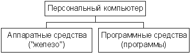 Компьютер – это электронное устройство, предназначенное для работы с информацией, а именно введение, обработку, хранение, вывод и передачу информации. Кроме того, ПК представляет собой единое двух сущностей – аппаратной и программной частей (что и отражено на следующей схеме).  Согласно определению компьютера компоненты компьютера можно разделить на устройства, которые выполняют определенные функции, связанные с информацией. | Компоненты компьютера | | Устройства обработки информации (процессор) | | Устройства ввода информации (клавиатура, мышь, трекбол, джойстик, сканер, микрофон и т.д.) | | Устройства вывода информации (монитор, принтер, плоттер, колонки и т. д.) | | Устройства хранения информации (дискета 1,44 Мб, компакт-диск 650 Мб, винчестер ~100 Гб, магнитная лента 2 Гб, магнитооптический диск, zip-диск 100 Мб, DVD-диск – 4,7-17 Гб) | | Устройства передачи информации (модем, телефакс) | 2. Основные типы компьютеров. Конфигурации персональных компьютеров (ПК) Персональный компьютер с технической точки зрения можно определить как единую систему, представляющую собой набор сменных компонентов, соединенных между собой стандартными интерфейсами. Компонентом здесь выступает отдельный узел (устройство), выполняющий определенную функцию в составе системы. Интерфейсом называют стандарт присоединения компонентов к системе. В качестве такового служат разъемы, наборы микросхем, генерирующих стандартные сигналы, стандартный программный код. В компьютерной индустрии существует набор однотипных компонентов с разными функциональными возможностями (и, соответственно, с разной стоимостью), включаемых в систему по единому интерфейсу. Полное описание набора и характеристик устройств, составляющих данных компьютер, называется конфигурацией ПК. Существует “минимальная” конфигурация ПК, т.е. минимальный набор устройств, без которых работа с ПК становится бессмысленной. Это: системный блок, монитор, клавиатура, мышь. Обычно под набором комплектующих, объединенных понятием “типовой персональный компьютер”, понимают следующий их состав: | | | системная (материнская) плата; | | | | | | | | | | | | | | | | | | | | | На компьютерном рынке сложилось следующее разделение конфигураций персональных компьютеров. Рабочая станция (Work Station) представляет собой мощный компьютер, основанный обычно на двухпроцессорной платформе, оснащенный максимальным объемом быстрой оперативной памяти, массивом жестких дисков и часто включенный в локальную сеть предприятия. В зависимости от решаемых задач рабочие станции бывают графическими, для научных расчетов или иного назначения. Графическую рабочую станцию комплектуют ЗD-видеокартой профессионального класса, устройствами оцифровки и захвата сигналов телевизионного формата, высокоточными сканерами и другим необходимым оборудованием. Настольный компьютер (Desktop) предусматривает самый обширный спектр возможных конфигураций, как платформы, так и дополнительных устройств. Принято классифицировать настольные компьютеры по предназначению или по производительности. По назначению компьютеры подразделяют на офисные, домашние, игровые, дизайнерские. По производительности различают компьютеры начального уровня (Easy PC), среднего уровня (Mainstream), высшего класса (High End). Офисный компьютер ориентирован на работу с программами офисного класса, може
